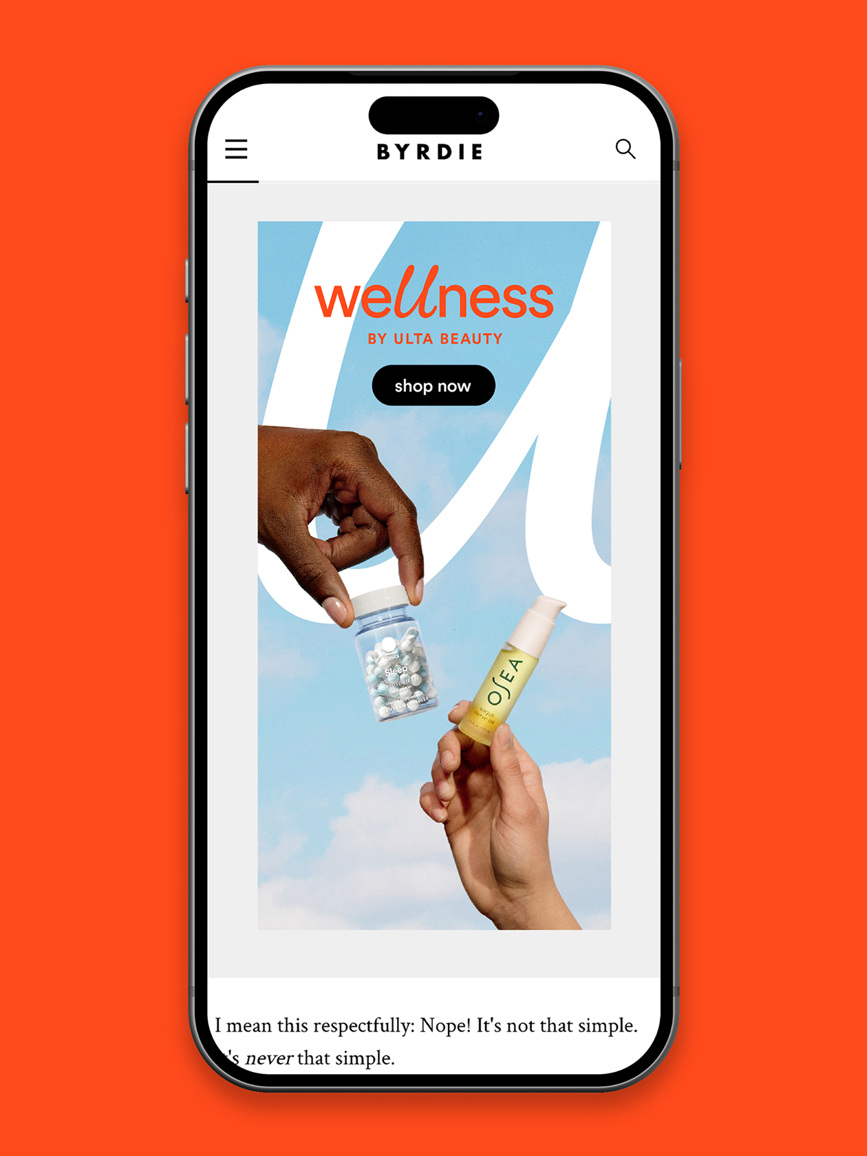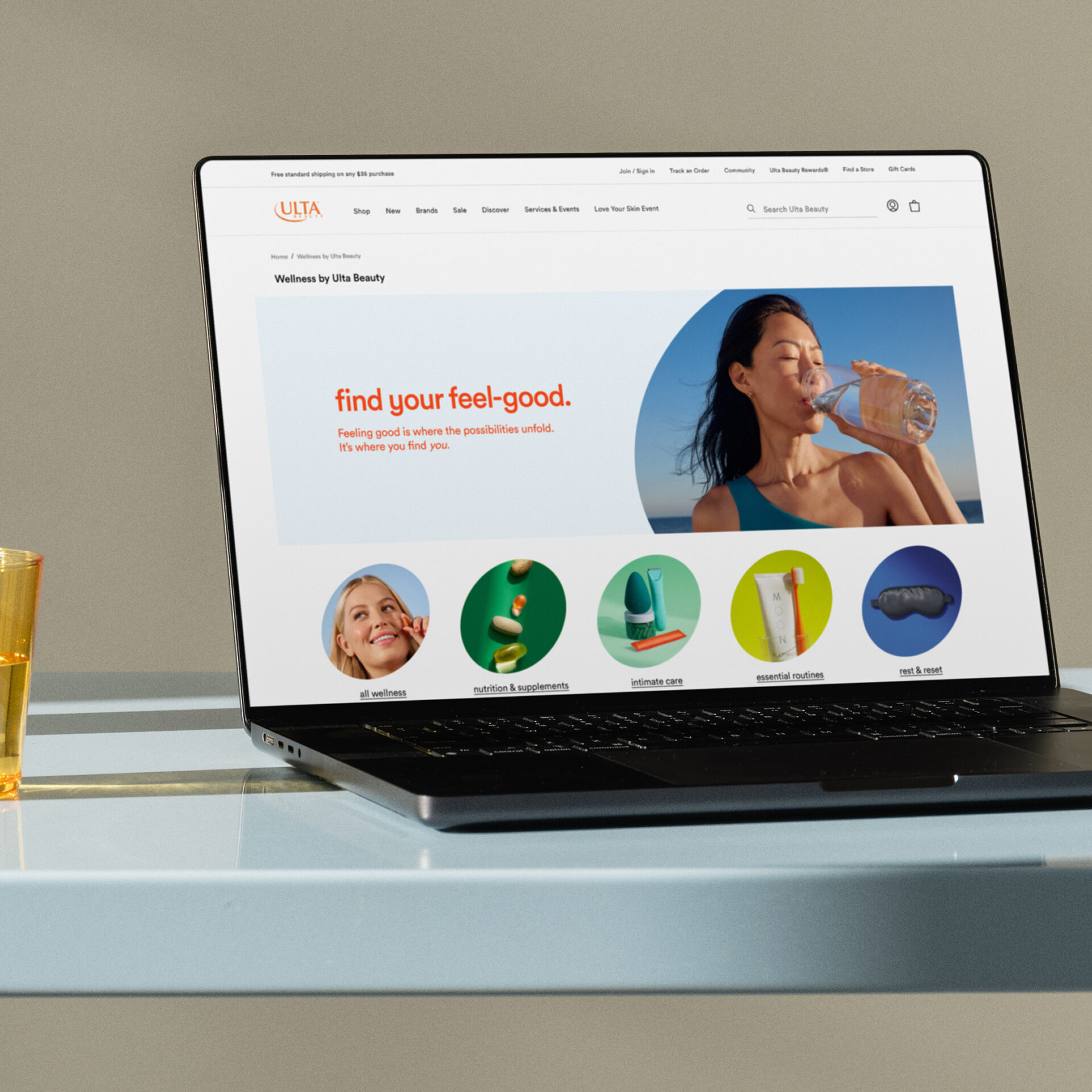 Ulta Beauty’s first forays into wellness struck a nerve. But business impact for an $11B+, coast-to-coast icon with 46M loyalists takes more than positive indicators. They needed a true sub-brand--one that would resonate with existing fans while inviting a whole new kind of guest. So we set out to build a first-of-its-kind, category-owning destination that rises above the typical wellness noise with a single mission: make it feel (actually, really) good. From positioning, consumer research and product architecture to a refreshing world of blue skies, crisp, helpful color and elegant movement, Wellness by Ulta Beauty welcomes you as you are, and for who you want to become.
